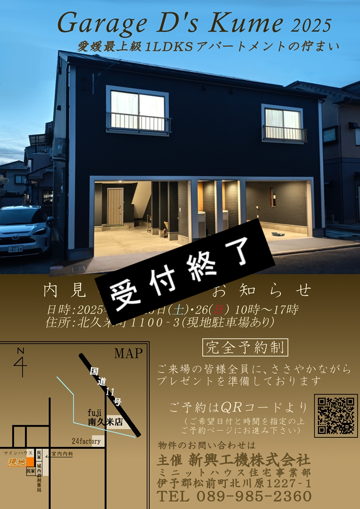 松山市北久米町に日本初となる、メゾネットスキップフロア1LDKSガレージハウスの内見会を開催いたします。